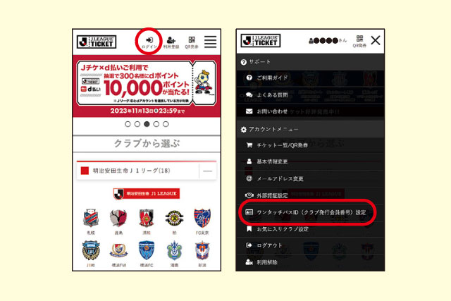 JリーグチケットサイトからJリーグIDでログイン後、アカウントメニューから「ワンタッチパスID(クラブ発行会員番号)設定」をクリック。