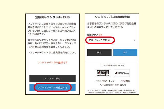 「ワンタッチパスIDを追加する」をクリックし、「登録クラブ」から「アルビレックス新潟」を選択し「次へ」をクリック。