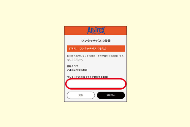 「ワンタッチパス(クラブ発行会員番号)」の欄に、ワンタッチパスIDを入力いただき「STEP2」へのボタンをクリック。