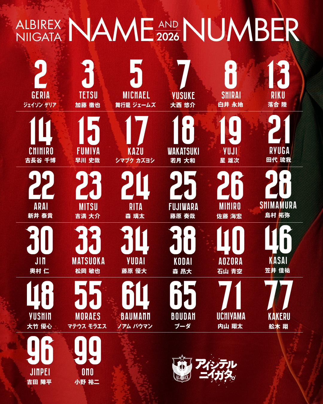 採用されたのは、新潟県の木「雪椿」を象徴する深紅。厳しい冬の寒風や雪に耐え、鮮やかな花をつけるその姿に、激動の時代を力強く駆け抜け、ピッチで咲き誇るというクラブの決意を込めました。