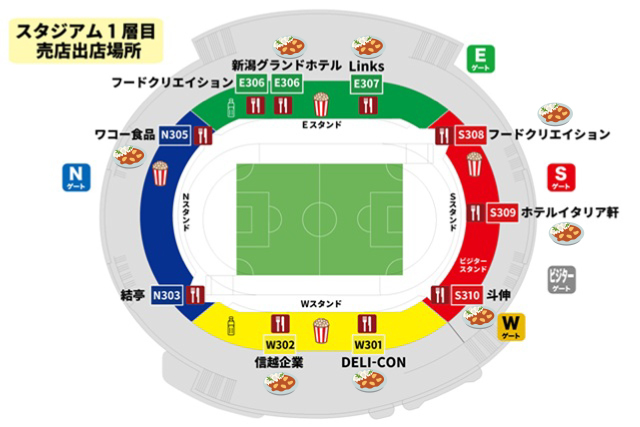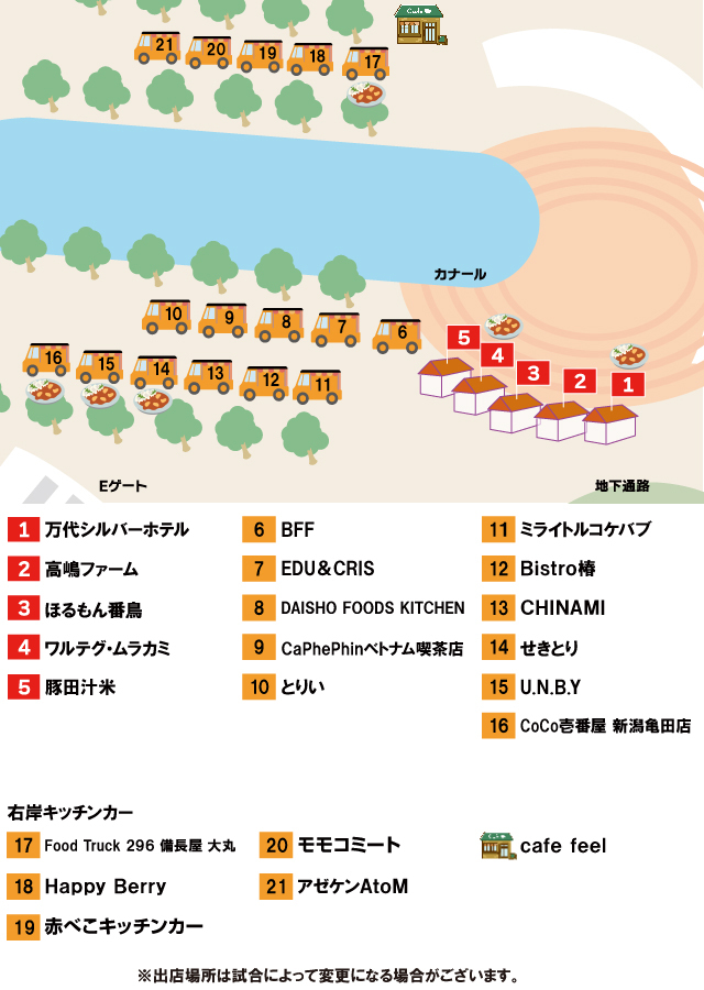 カレールウ消費量全国トップクラスの新潟市が誇るカレーがスタジアムに集合!サポーターの皆さんおなじみのカレーをはじめ、スタジアム場内・場外のグルメ店舗では、個性あふれるカレーメニューをご用意しました!