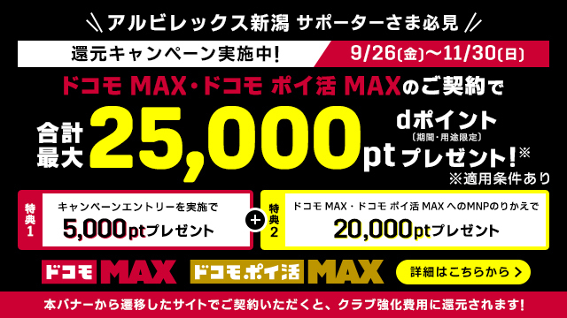当クラブでは、株式会社NTTドコモとの協業により、DAZNが追加料金なしで見放題の「ドコモ MAX」「ドコモ ポイ活 MAX」のご契約と、エントリーでdポイントがもらえる「アルビレックス新潟ファン・サポーター必見 還元キャンペーン第1弾!dポイント5,000ptプレゼントキャンペーン」を実施します。