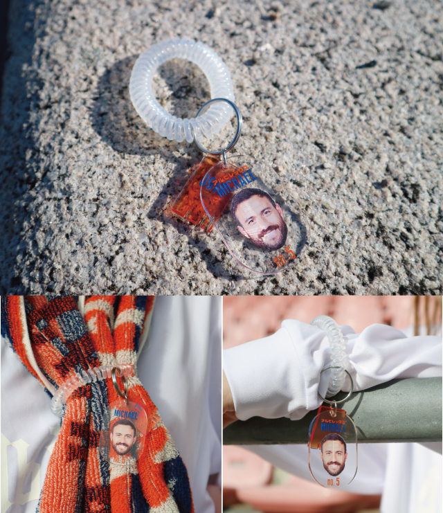 選手の名前と誕生日が入ったアクリルプレートに、懐かしいコインロッカーの鍵のようなコイルリングが付いたレトロかわいい新アイテム。キーリングも付いているので、お気に入りのアイテムと組み合わせたり、手首やタオルに付けたり、観戦コーデを可愛くアレンジしてくれます。