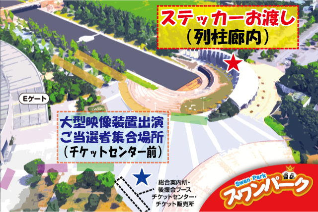 受け渡し場所にて「初めてスタジアムに来た」とスタッフにお伝えください。記念のステッカーをプレゼントいたします!