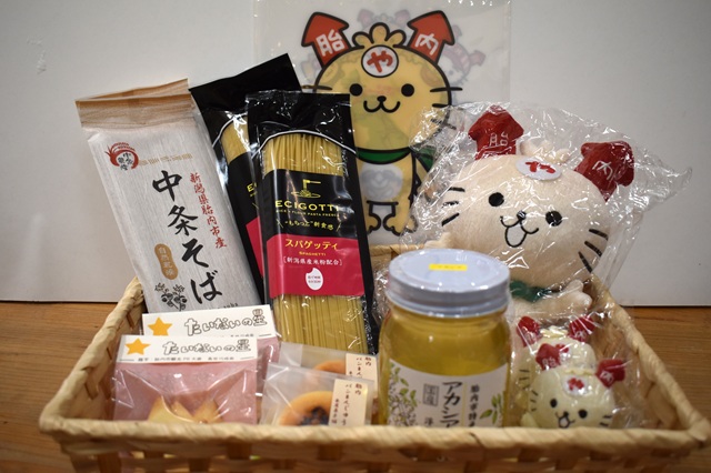 ・胎内産はちみつ、中条そば、米粉入りスパゲッティ、米粉サブレ、米粉パンまんじゅう