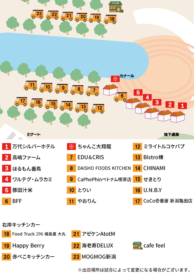 10月26日(日)にデンカビッグスワンスタジアムで開催するヴィッセル神戸戦(14:00キックオフ)におきまして、スタジアム内外に飲食売店が出店いたします。