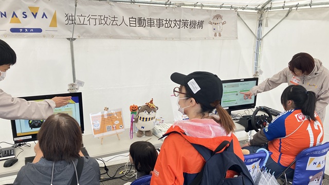 2023年より、ホームゲームでの啓発活動を実施いただいていますが、ご来場の皆様に好評なのは、毎年40万人以上のプロドライバーが受診する運転適性診断。運転シミュレーター模擬体験には、雨天にもかかわらず多くの方々にお越しいただいていました。