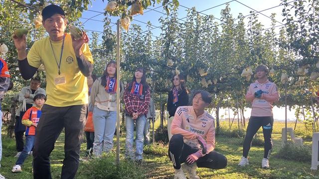 10月30日(木)、大竹優心選手と内山翔太選手が、新潟市南区にある白根グレープガーデンを訪問し、ル レクチエの栽培体験を行いました。5月に続いて2回目の実施となる今回の作業が、栽培体験の最終工程となります。