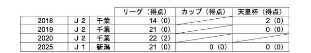 J1リーグ通算:21試合出場0得点、J2リーグ通算:57試合出場2得点、天皇杯通算:2試合出場0得点