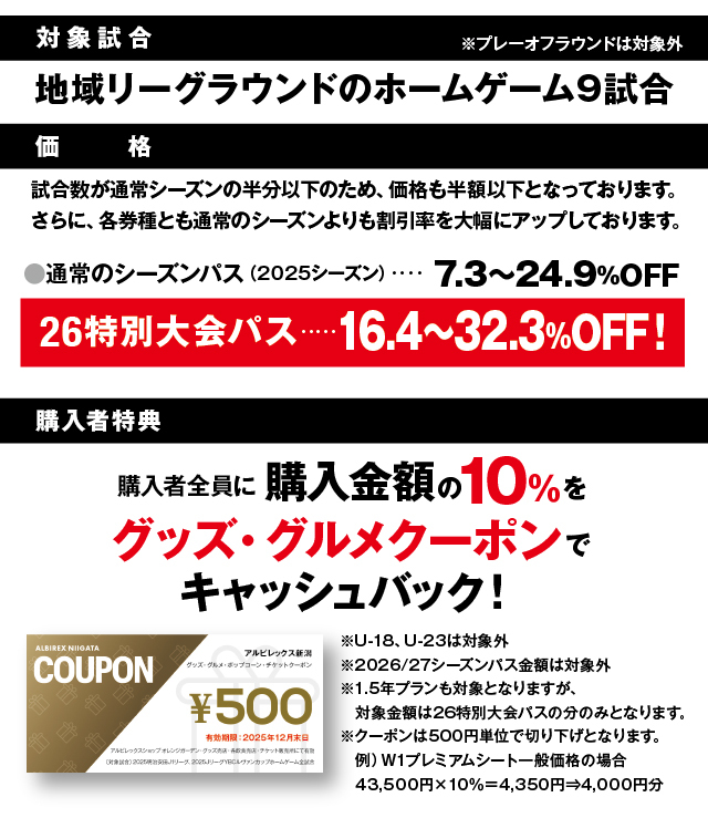 シーズン移行期である2026年のシーズンパスについて、以下のとおりご案内いたします。2026年もスタジアムで、温かいご声援をいただきたく何卒よろしくお願い申し上げます。