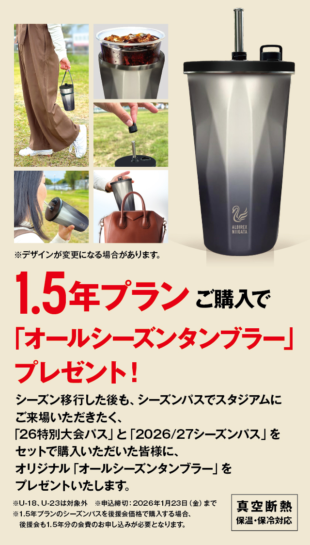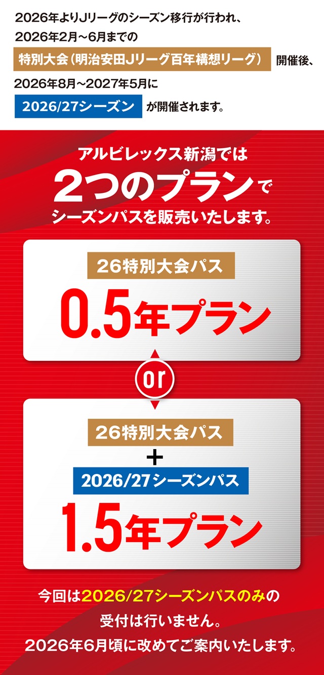 今回は1.5年プランとしてのみ受付を行い、2026/27シーズンパスのみの申し込みは、2026年6月頃に受付を行います。