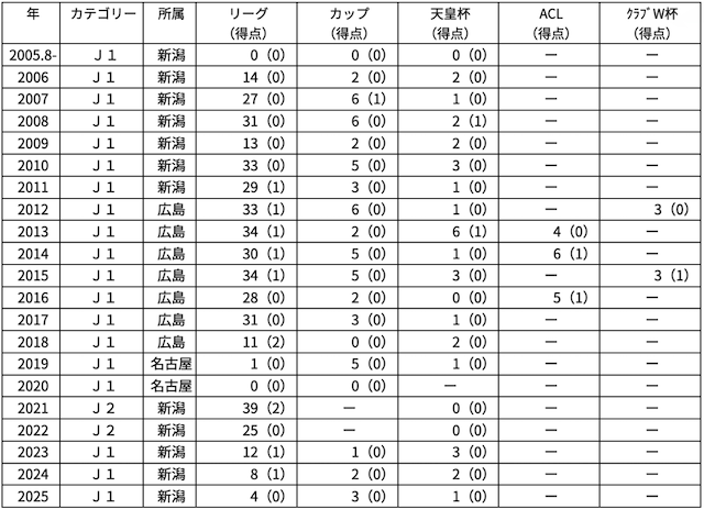 日生学園第二高 → AGOVVアプルドーレン/オランダ → ドートレヒト/オランダ → アルビレックス新潟 → サンフレッチェ広島 → 名古屋グランパス → アルビレックス新潟