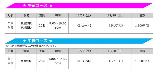 ※天災、その他事情によりスクールを中止する場合がございます。中止の場合はアルビレックス新潟サッカースクールブログでお知らせいたします。