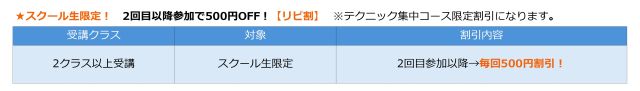 【テクニック集中コース】に限り、2回目以降は毎回500円OFF!
