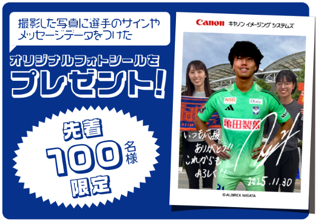 オフィシャルクラブパートナーであるキヤノンイメージングシステムズ株式会社(新潟市中央区)が、11月30日(日)の柏レイソル戦にて同社の最新のテクノロジーを活用した2つのイベントを開催します。