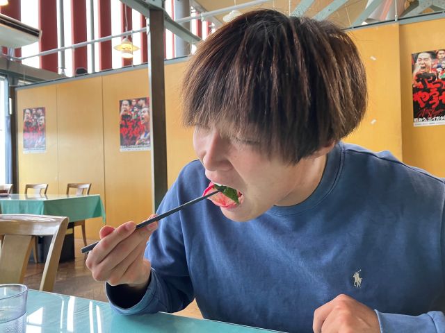 「新鮮な野菜はやっぱり美味しい!」と、サラダを手に満足そうな表情を見せる選手。
