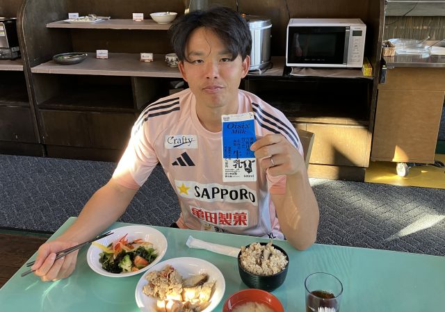 「この牛乳、美味しいんですよね!」と、笑顔で函館牛乳を持つ選手。