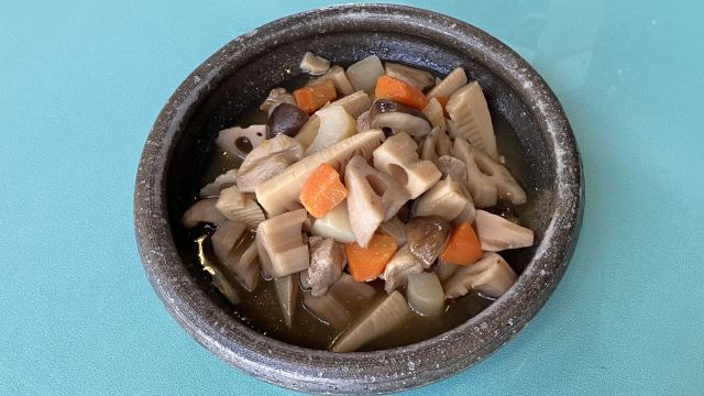 農家オブザイヤー金賞受賞!もちもち食感が楽しいもちうまステーキれんこんは、具だくさんの筑前煮に。「筑前煮だ!」と興奮気味の選手も多数。