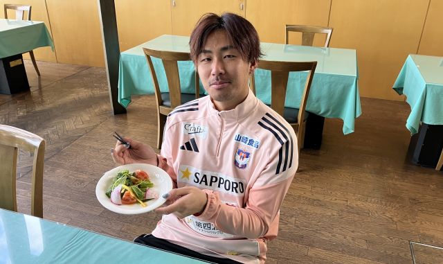 「新鮮な野菜はやっぱり美味しい!」と、サラダを手に満足そうな表情を見せる選手。