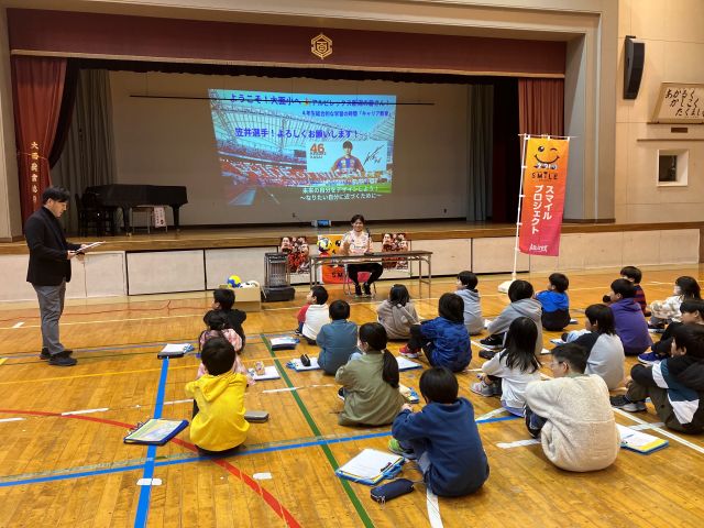 同校の4年生23名はスポーツ好きな児童が多く、一年を通してさまざまなスポーツチームがキャリア教育のため登壇されており、今回の訪問はその一環でお声がけいただきました。