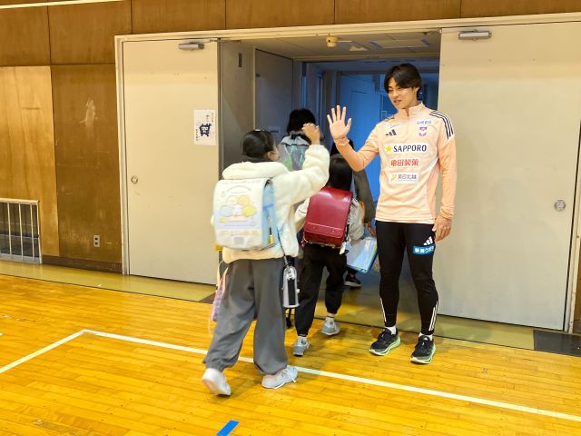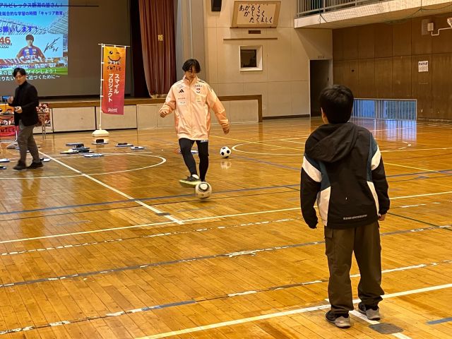 授業後半はミニサッカー教室を実施し、 児童全員とのパス交換やリフティングを披露しました。笠井選手は、自身の出身小学校が全校児童1,000人規模だったこともあり、「少人数だからこそできる交流に、僕自身も元気をもらいました」と語りました。