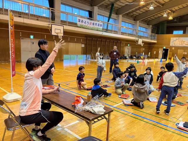 冬が近づき、肌寒くなってきた体育館。途中、寒そうにしている児童を見つけた笠井選手は、みんなが体を動かして暖かくなれるよう鬼ごっこを提案しました。教職課程での教育実習の経験を活かし、児童全体に目を配る笠井選手の細やかな優しさが光りました。