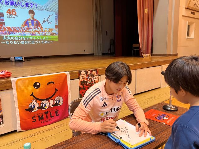 当クラブでは、今回のような学校訪問をはじめ、たくさんの笑顔に貢献するアクションとして、ホームタウン活動を「スマイルプロジェクト」と定義し、笑顔あふれる街づくりに取り組んでまいります。