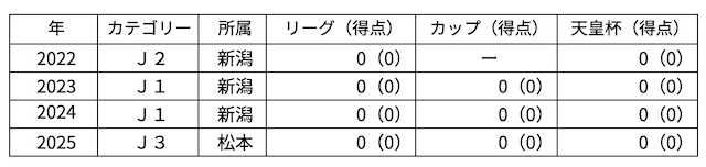 J1リーグ通算:0試合出場 0得点、J2リーグ通算:0試合出場 0得点カップ戦通算:0試合出場 0得点、天皇杯通算:0試合出場0得点