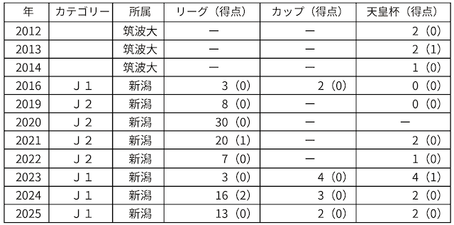 カップ戦通算:11試合出場 0得点、天皇杯通算:16試合出場2得点