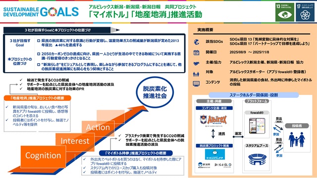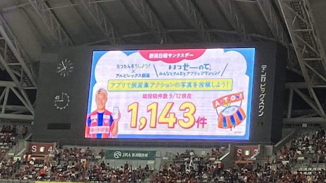 アルビレックス新潟も連携して、2025年9月13日(土)清水エスパルス戦での「新潟日報サンクスデー」の一環として、スマートフォンアプリ「fowald®(←https://fowald.com/ をテキストにリンク)」を使っての脱炭素アクションの投稿や、試合当日のイベント等を通じて、県民に一斉にアクションすることを呼びかけました。