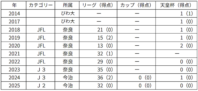 JFL通算:110試合出場3得点、天皇杯通算:7試合出場1得点