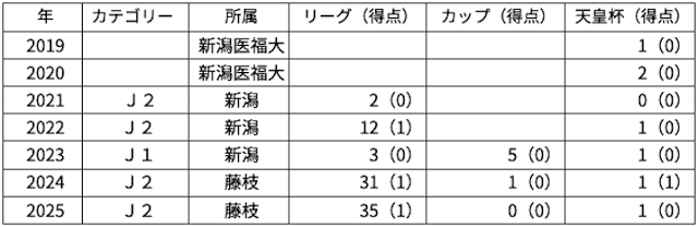 カップ戦通算:6試合出場 0得点、天皇杯通算:7試合出場1得点