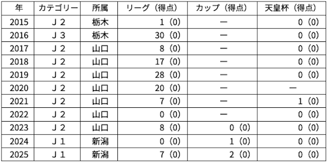 J1リーグ通算:7試合出場 0得点、J2リーグ通算:89試合出場 0得点、J3リーグ通算:30試合出場 0得点