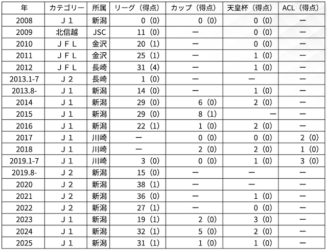 成立学園高 → アルビレックス新潟 → JAPANサッカーカレッジ → ツエーゲン金沢 → V・ファーレン長崎 → アルビレックス新潟 → 川崎フロンターレ → アルビレックス新潟