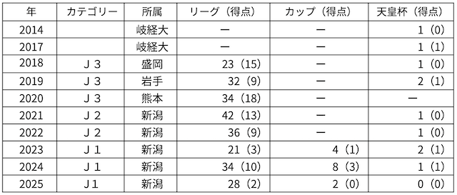 海山FC → 紀州エスフォルソ → 四日市中央工高 → 岐阜経済大 → いわてグルージャ盛岡 → ロアッソ熊本 → アルビレックス新潟