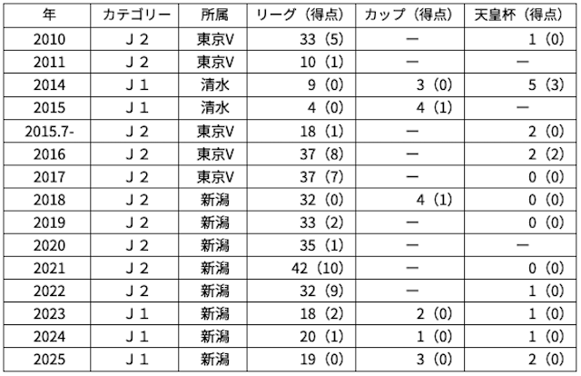 J1リーグ通算:70試合出場3得点、J2リーグ通算:309試合出場44得点