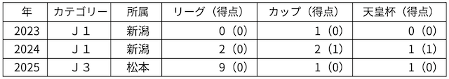 J1リーグ通算:2試合出場0得点、J3リーグ通算:9試合出場0得点