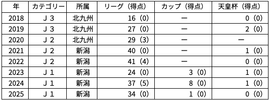 J1リーグ通算:95試合出場5得点、J2リーグ通算:110試合出場7得点、J3リーグ通算:43試合出場0得点