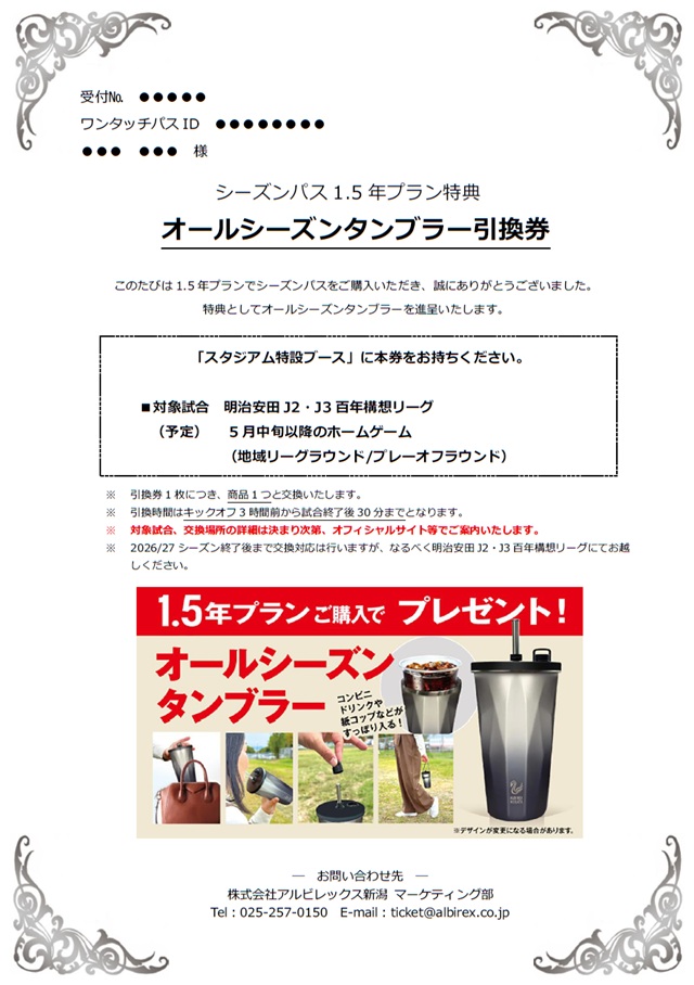 ※1.5年プランをお申し込みいただいた場合も「明治安田J2・J3百年構想リーグの情報カードのみ」となります。2026/27シーズンの情報カードは、7月頃お送りいたします。