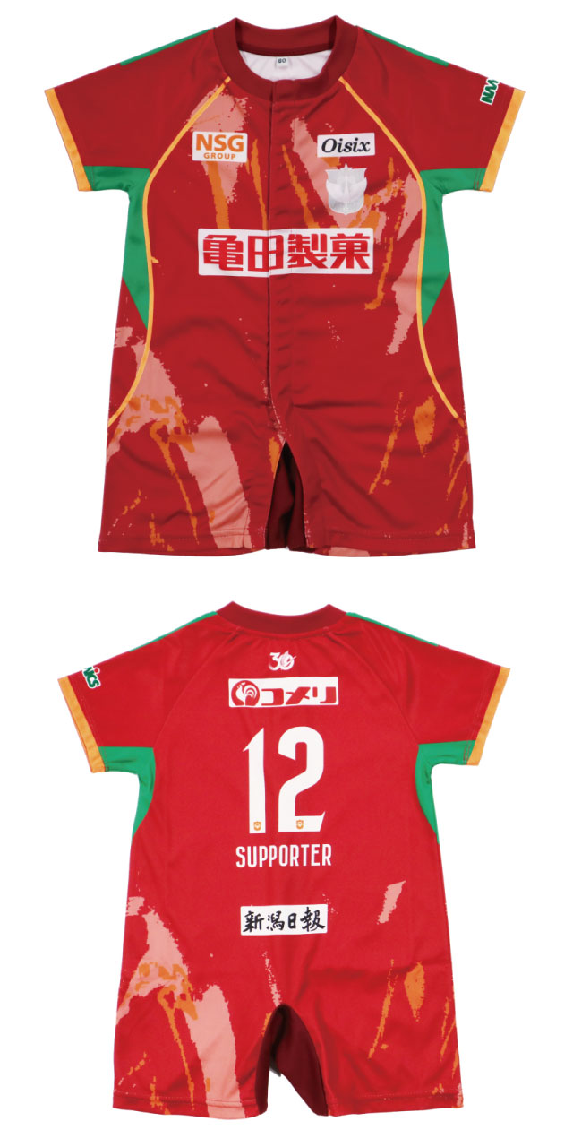 Tシャツ感覚でサラッと着られる、前開きタイプのユニフォームロンパース。 全開になるので、お着替えが驚くほど簡単です。 生まれた瞬間からアルビに染まって、小さなサポーターとしてデビューしよう!