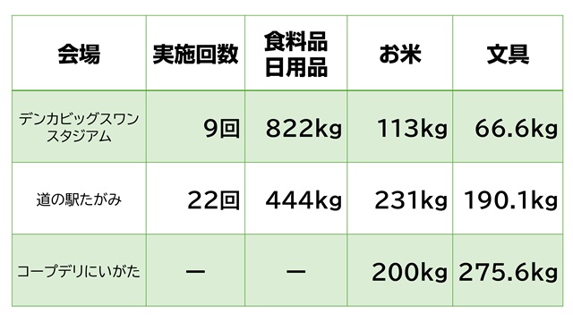 この結果、2025年2月から12月まで、道の駅たがみ(田上町)とホームゲーム会場において全31回実施したフードドライブでお預かりしました寄付の総重量は、2,342kgに達しました。活動にご協力いただいた皆様、本当にありがとうございました。