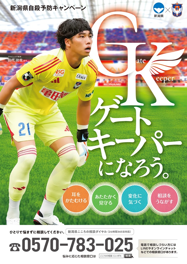 このたび、当クラブ所属のゴールキーパー・田代琉我選手を起用いただいたゲートキーパーの普及啓発ポスターが完成しましたので、お知らせいたします。当クラブでは、2020年から新潟県と連携して自殺防止のための普及啓発に取り組んでおり、今年で7年目となります。