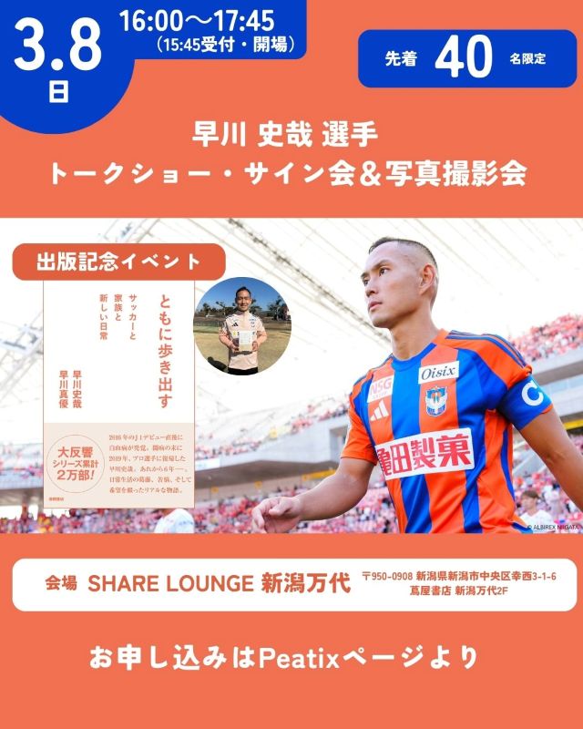 3月8日(日)蔦屋書店 新潟万代2F「SHARE LOUNGE 新潟万代」早川 史哉 選手トークショー・サイン会&写真撮影会を開催!!