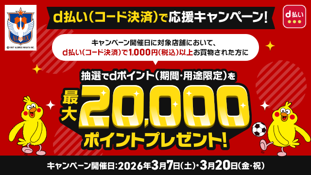 オフィシャルクラブパートナーである株式会社NTTドコモでは、試合当日、スタジアム内の飲食売店やグッズ売店にて、「d払い」で合計1,000円(税込)以上お支払いいただいた方を対象に、dポイントが当たるキャンペーンを実施します。