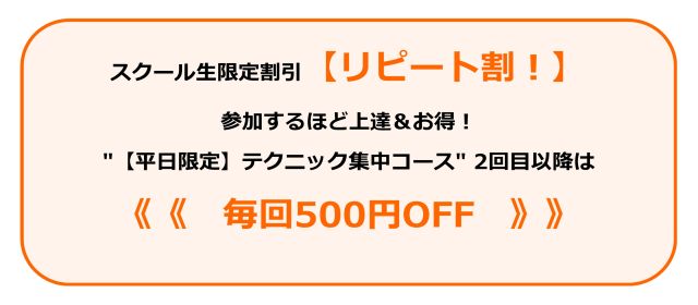【平日限定・テクニック集中コース】に限り、2回目以降は毎回500円OFF!