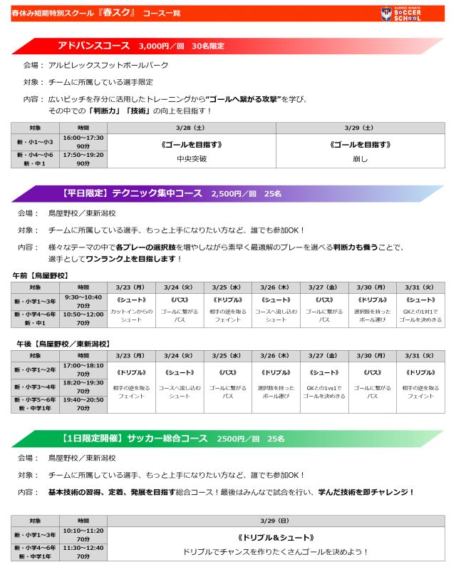 アルビレックス新潟サッカースクールでは春休み短期特別スクール『春スク』を【3月23日(月)~3月31日(火)】の期間にて開催いたします!