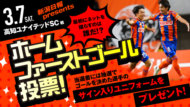 ユニフォームパートナーである新潟日報社が3月7日(土)の明治安田J2・J3百年構想リーグの高知ユナイテッドSC戦を対象にホームゲームの初得点選手を予想する「ホームファーストゴール投票」を実施いたします