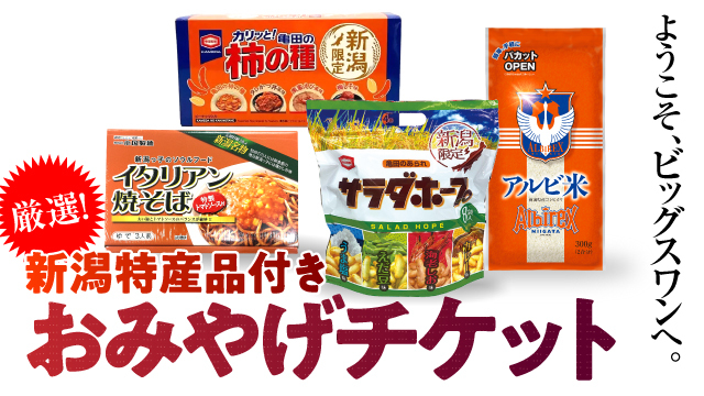 ビジターサポーターの皆様に新潟の名産品を味わっていただけるよう、新潟の美味しい名産品とチケットがセットになった「おみやげチケット」を販売します。