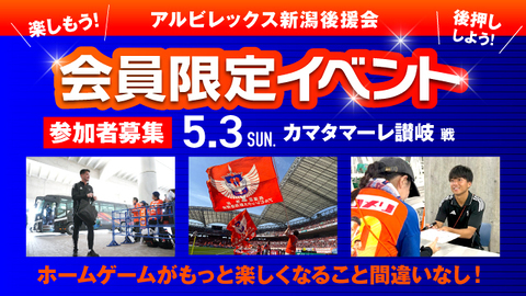 アルビレックス新潟後援会では、5月3日(日・祝)に開催されるカマタマーレ讃岐戦で、以下の通り会員限定イベントを実施いたしますのでお知らせいたします。