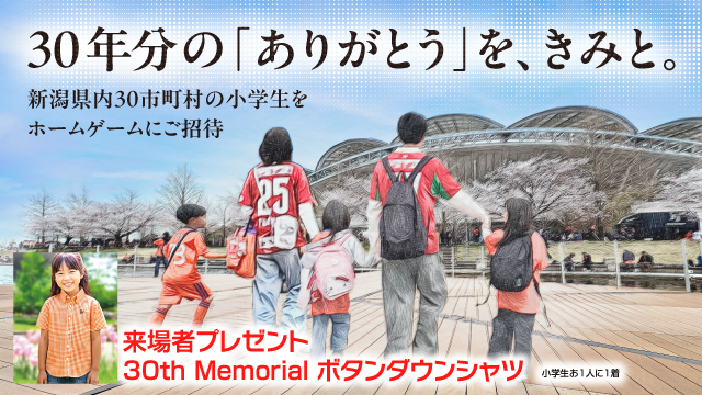 当クラブは、法人設立30周年記念事業として、新潟県内の全30市町村の小学生を5月のホームゲームにご招待いたします。